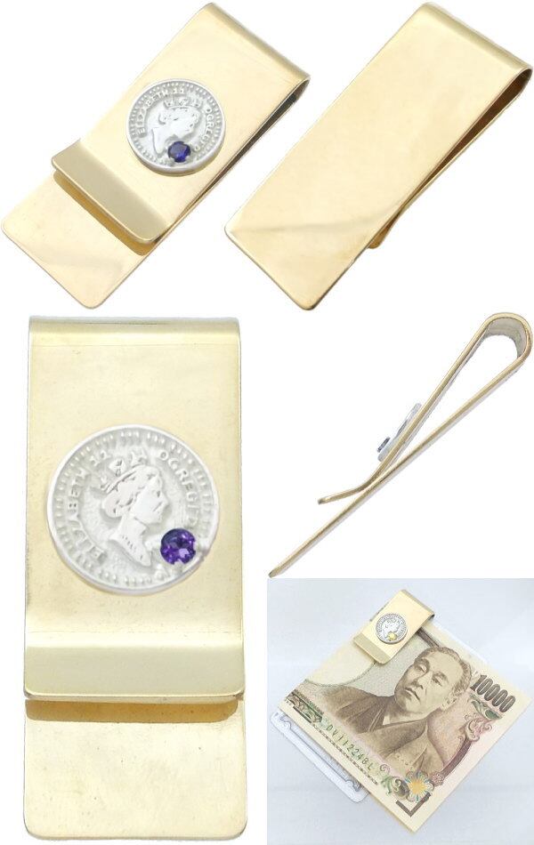 (9月)サファイア ホワイト エリザベス コイン スリム ブラスマネークリップ 誕生石*BM-1035