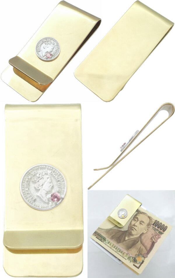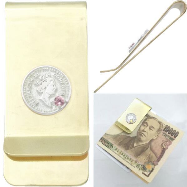 (10月)ピンクトルマリン ホワイト エリザベス コイン ブラスマネークリップ 誕生石*BM-1037
