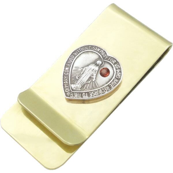 ★ハート型のマリアメダイと誕生石のさり気ないコンビのブラスボディマネークリップ。