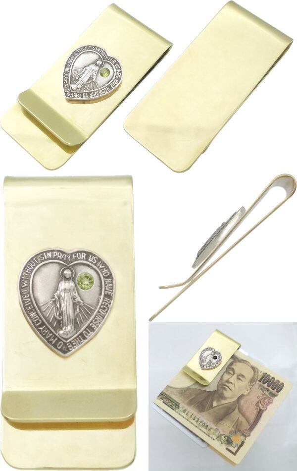 ★ハート型のマリアメダイと誕生石のさり気ないコンビのブラスボディマネークリップ。