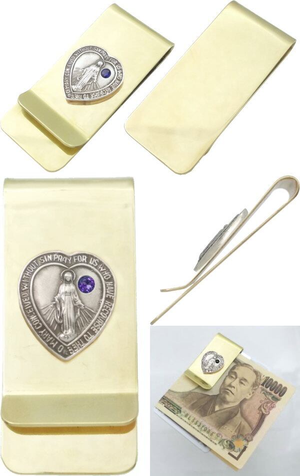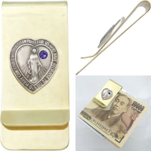 ★ハート型のマリアメダイと誕生石のさり気ないコンビのブラスボディマネークリップ。