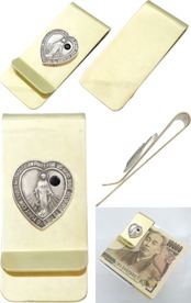 ★ハート型のマリアメダイと誕生石のさり気ないコンビのブラスボディマネークリップ。