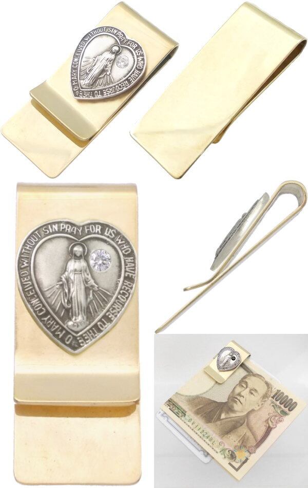 ★ハート型のマリアメダイと誕生石のさり気ないコンビのブラスボディマネークリップ。