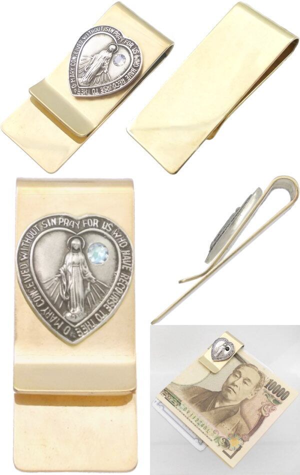★ハート型のマリアメダイと誕生石のさり気ないコンビのブラスボディマネークリップ。