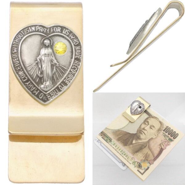 ★ハート型のマリアメダイと誕生石のさり気ないコンビのブラスボディマネークリップ。