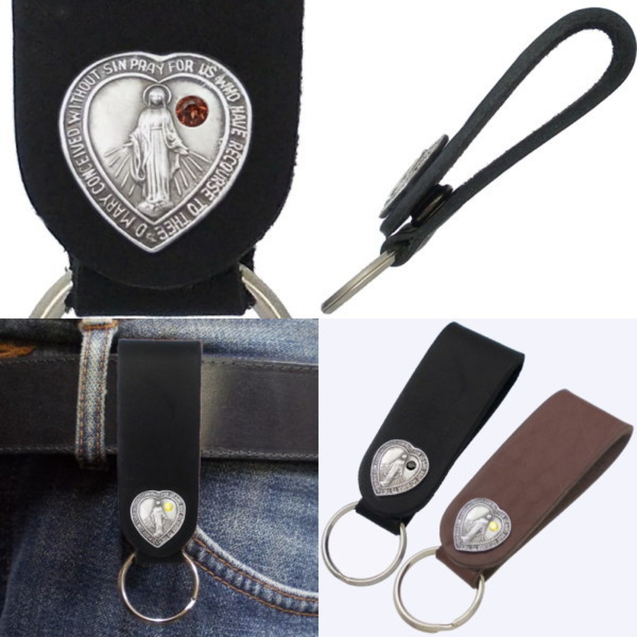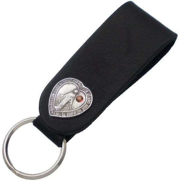★ハート型のマリアメダイと誕生石のさり気ないコンビのサドルレザー製キーホルダー。