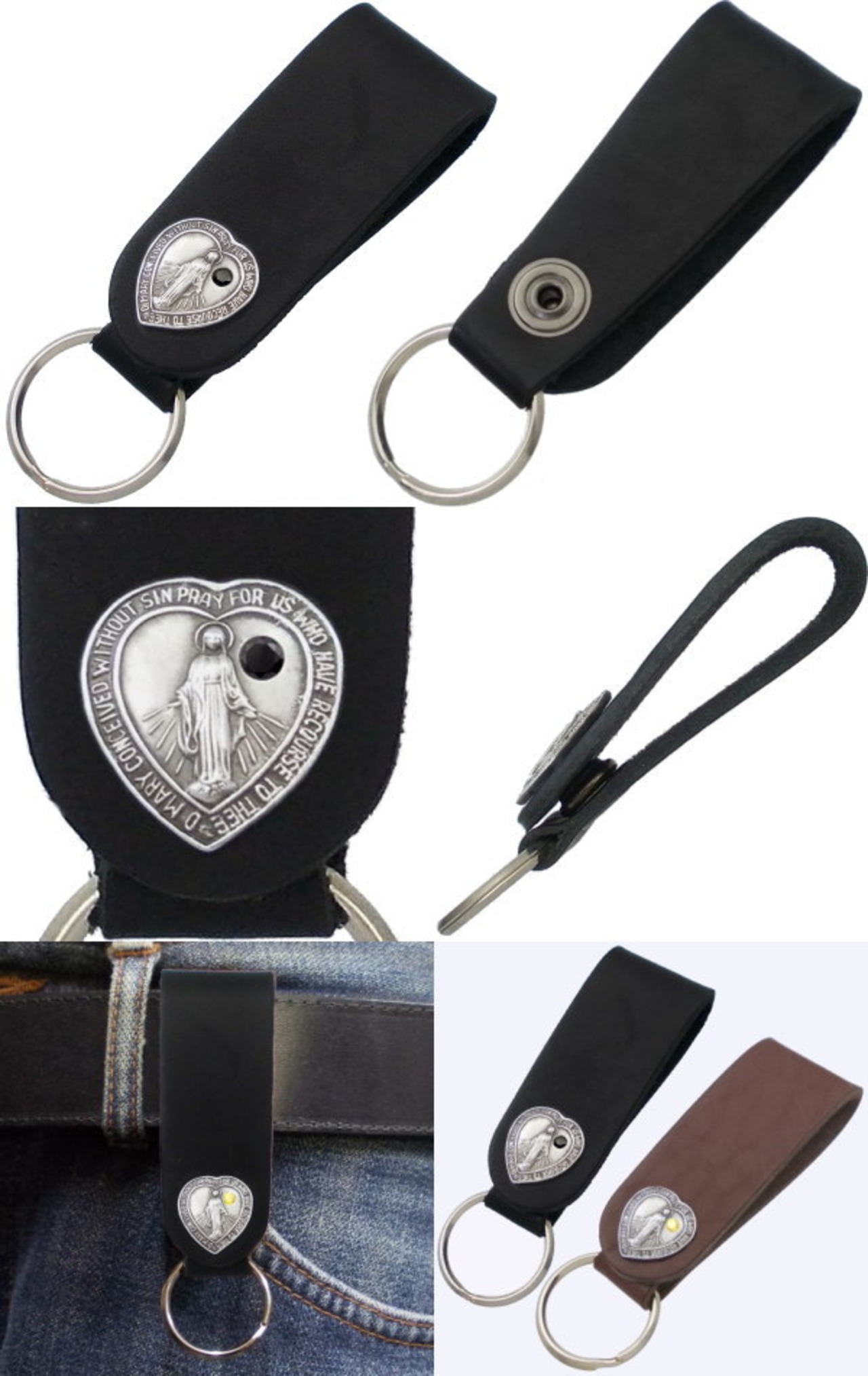 ★ハート型のマリアメダイと誕生石のさり気ないコンビのサドルレザー製キーホルダー。
