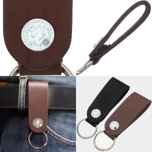 ★エリザベス女王のシルエットの小さめコインモチーフのサドルレザー製キーホルダー。