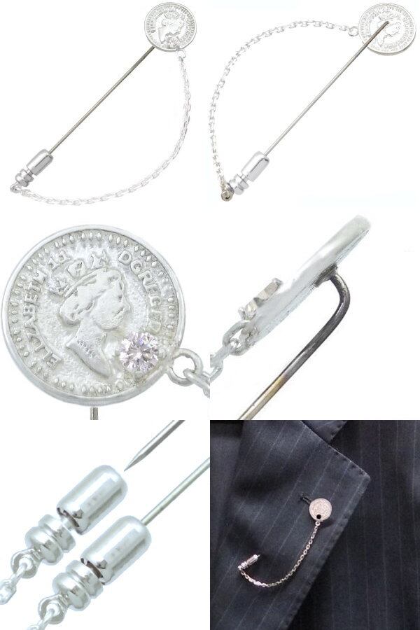 (4月)ジルコニア ホワイト エリザベス コイン チェーン シルバー ラペルピン 誕生石*BK-1219