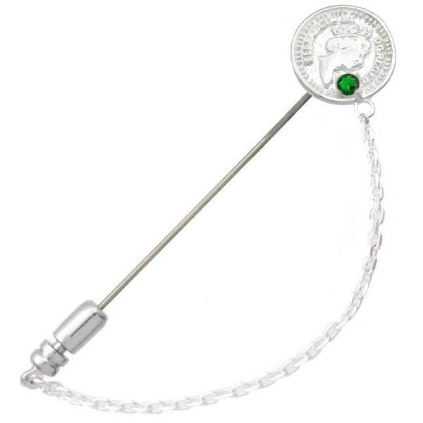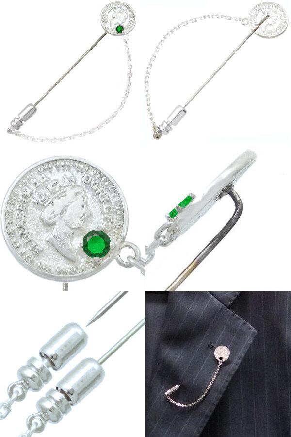 (5月)エメラルドグラス ホワイト エリザベス コイン チェーン シルバー ラペルピン 誕生石*BK-1219