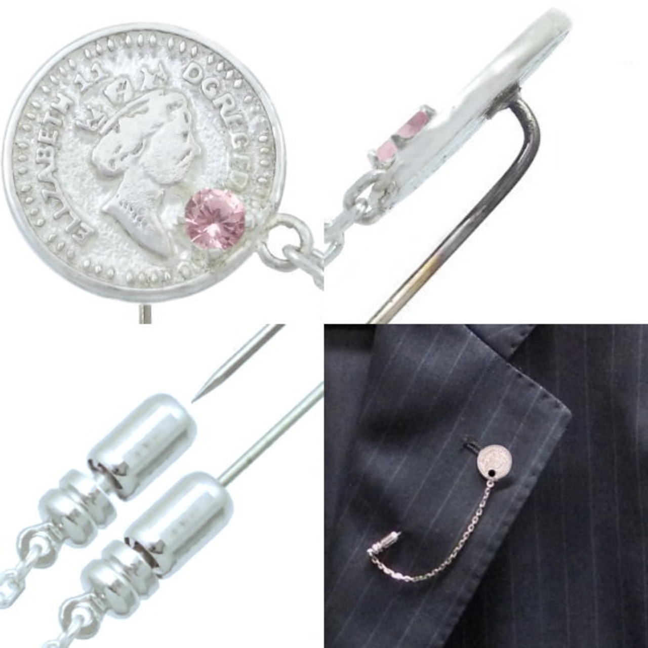 (10月)ピンクトルマリン ホワイト エリザベス コイン チェーン シルバー ラペルピン 誕生石*BK-1219