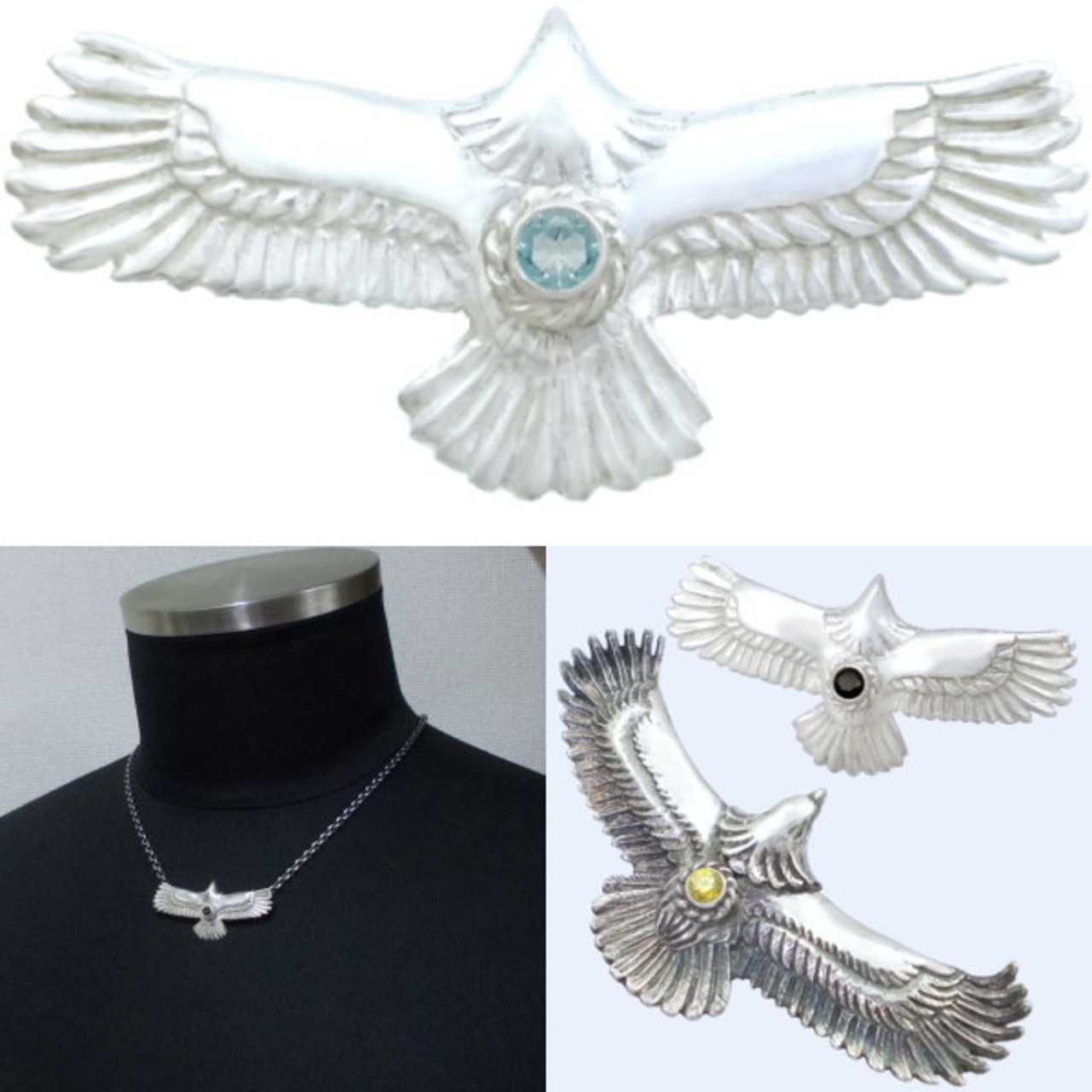 ネイティブの定番人気イーグルの背にツイステッドワイヤーで飾ったバースデーストーンをセッテイング。迫力とリアルなラージサイズとは対照的にカジュアルなサイズとアレンジ。