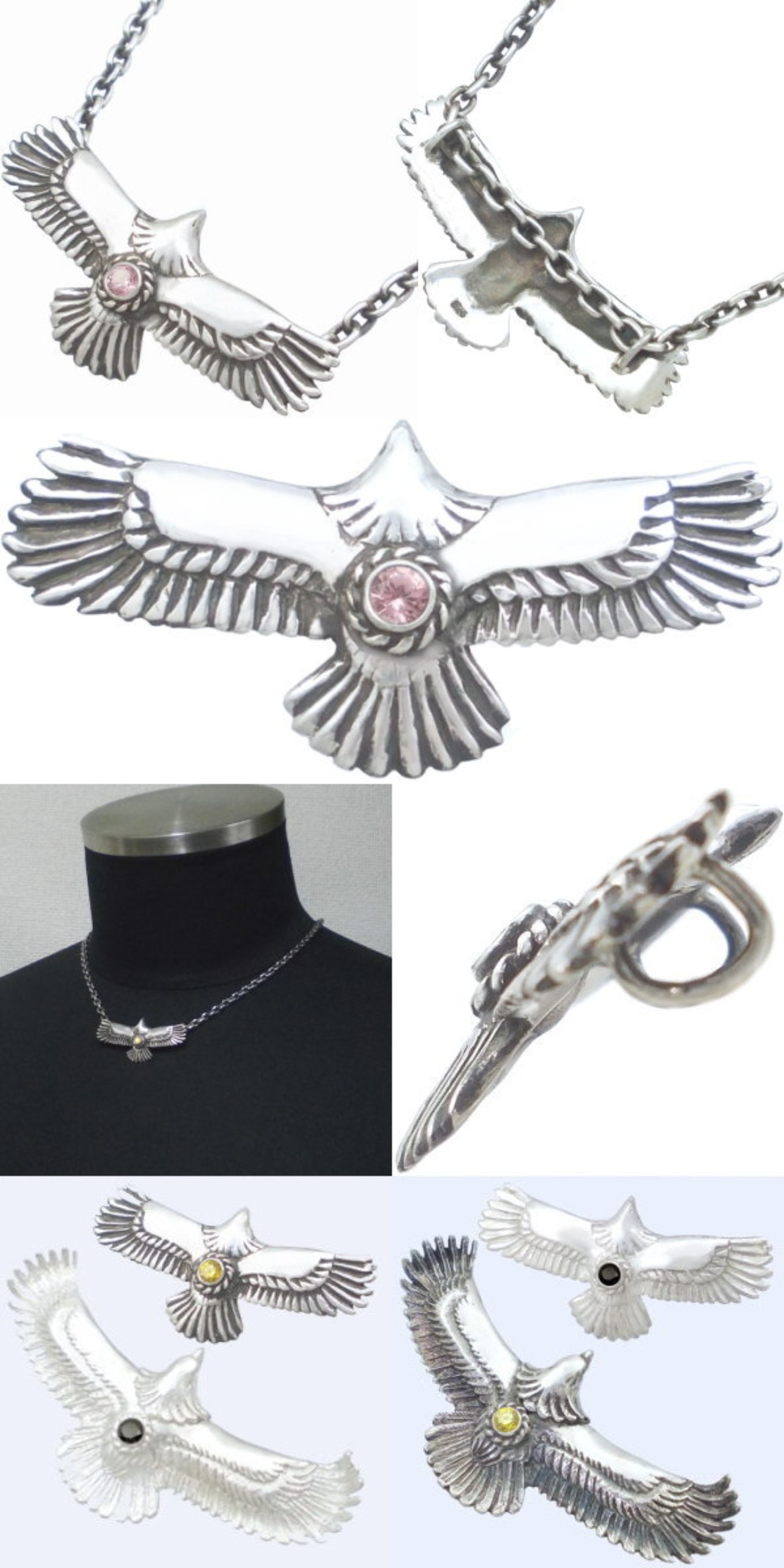 ネイティブの定番人気イーグルの背にツイステッドワイヤーで飾ったバースデーストーンをセッテイング。迫力とリアルなラージサイズとは対照的にカジュアルなサイズとアレンジ。