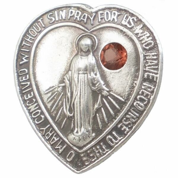 マリアをセンターにしたハート型のメダイに左胸をイメージした位置にバースデーストーンをセッティング。燻しの入った落ち着いた雰囲気と適度なボリューム感から男性にもおススメ。