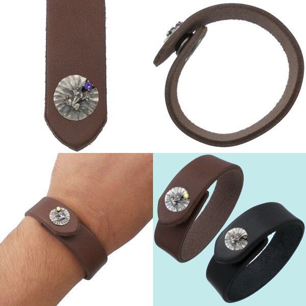 ★睡蓮の葉に張り付くカエルとその切れ目に誕生石をセットしたサドルレザーブレス。
