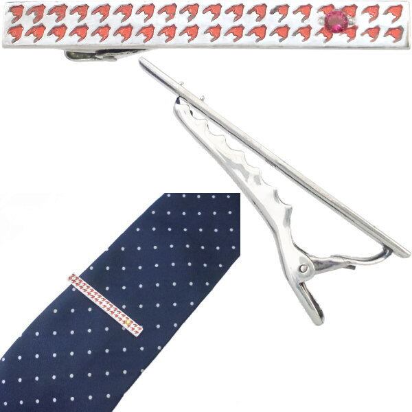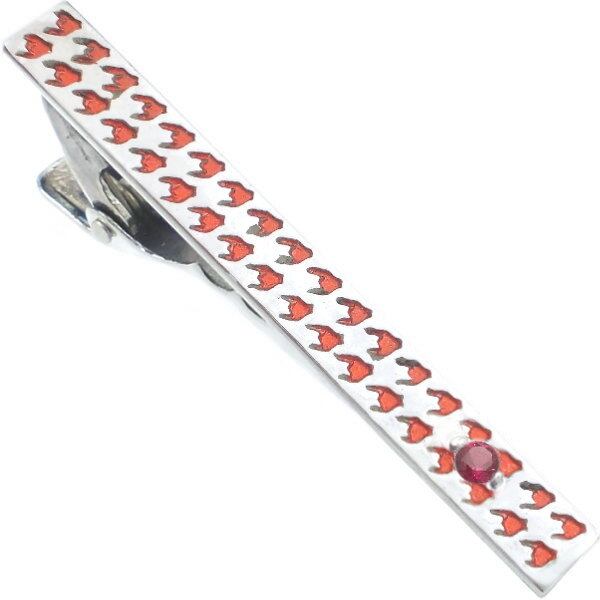 定番中の定番チドリ柄に2本爪で誕生石をセッティングしたネクタイピン。セラミックレッドの千鳥が並ぶ華やかな色遣いはワンポイントのアクセントとしても目を引く。裏面は艶消し燻し仕上げで落ち着いた風合いに。