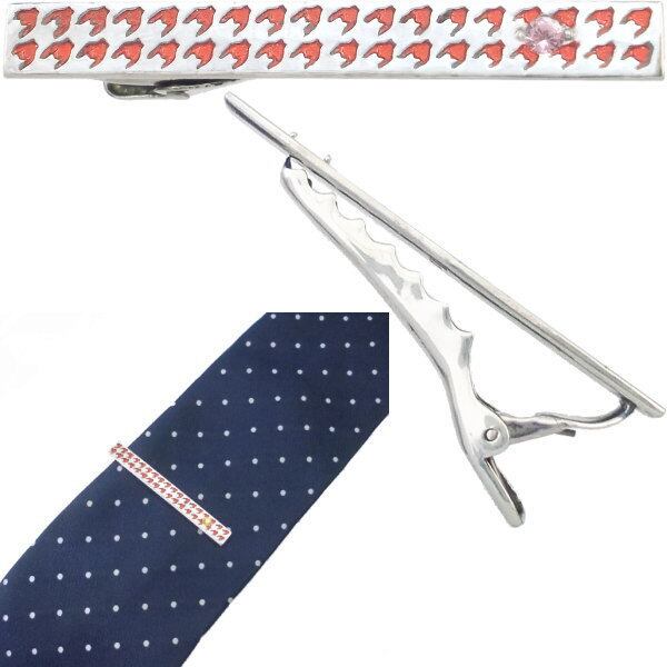 定番中の定番チドリ柄に2本爪で誕生石をセッティングしたネクタイピン。セラミックレッドの千鳥が並ぶ華やかな色遣いはワンポイントのアクセントとしても目を引く。裏面は艶消し燻し仕上げで落ち着いた風合いに。