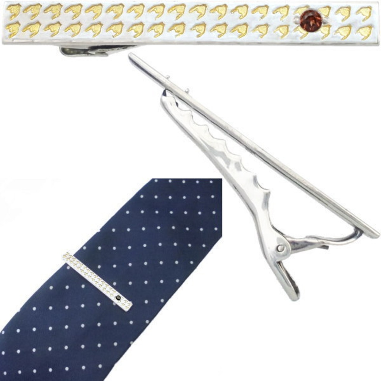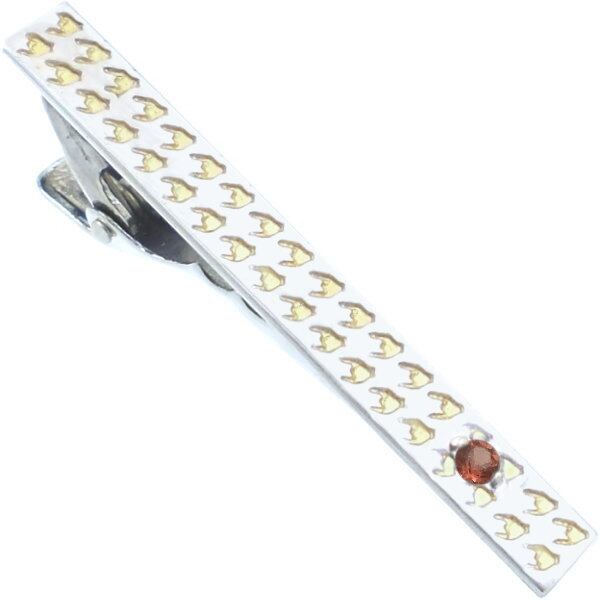 定番中の定番チドリ柄に2本爪で誕生石をセッティングしたネクタイピン。セラミックゴールドの千鳥が並ぶ華やかな色遣いはワンポイントのアクセントとしても目を引く。裏面は艶消し燻し仕上げで落ち着いた風合いに。