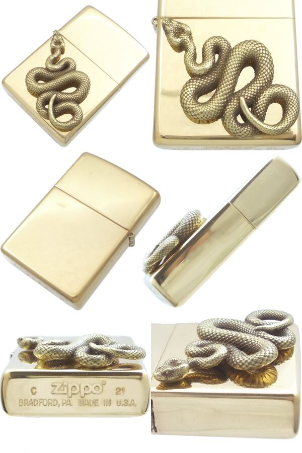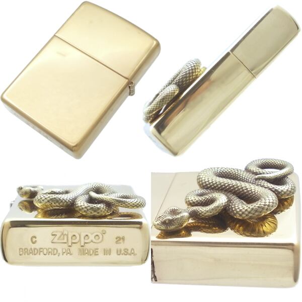 真鍮燻し仕上げのモチーフのスネークが運気を運ぶド迫力のジッポ。ジッポのボディも無垢のブラスで使い込む程に素材の深みと味が増す素材感も魅力。