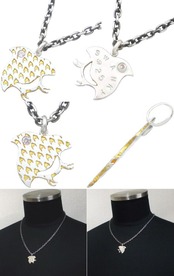 和風の千鳥柄の中にセラミックゴールドの千鳥格子を掛け合わせたペンダント。しかも目の部分には誕生石をセッティング。バースデーストーンの他シックなブラック、気分も運気も上げてくれそうなイエローのジルコニアも用意、誕生月に拘らずマイカラーでも選んでほしい。