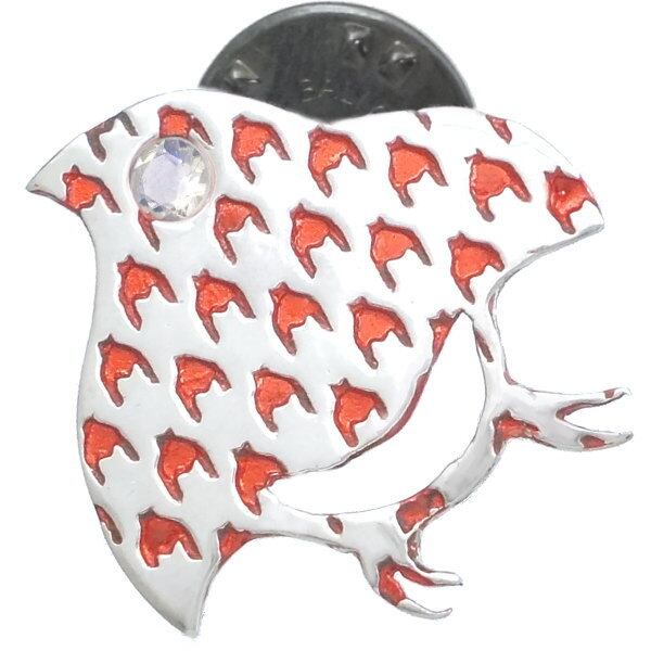 和風の千鳥柄の中にセラミックレッドの千鳥格子を掛け合わせたピンバッヂ。しかも目の部分には誕生石をセッティング。バースデーストーンの他シックなブラック、気分も運気も上げてくれそうなイエローのジルコニアも用意、誕生月に拘らずマイカラーでも選んでほしい。