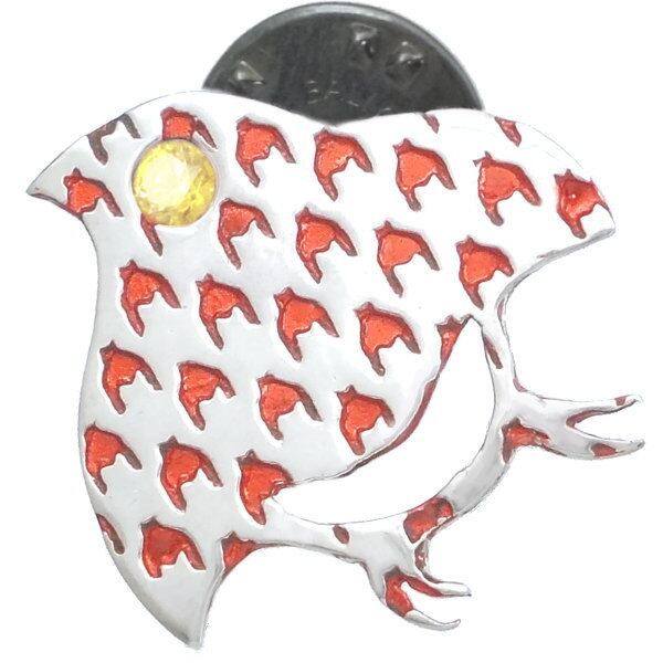 和風の千鳥柄の中にセラミックレッドの千鳥格子を掛け合わせたピンバッヂ。しかも目の部分には誕生石をセッティング。バースデーストーンの他シックなブラック、気分も運気も上げてくれそうなイエローのジルコニアも用意、誕生月に拘らずマイカラーでも選んでほしい。