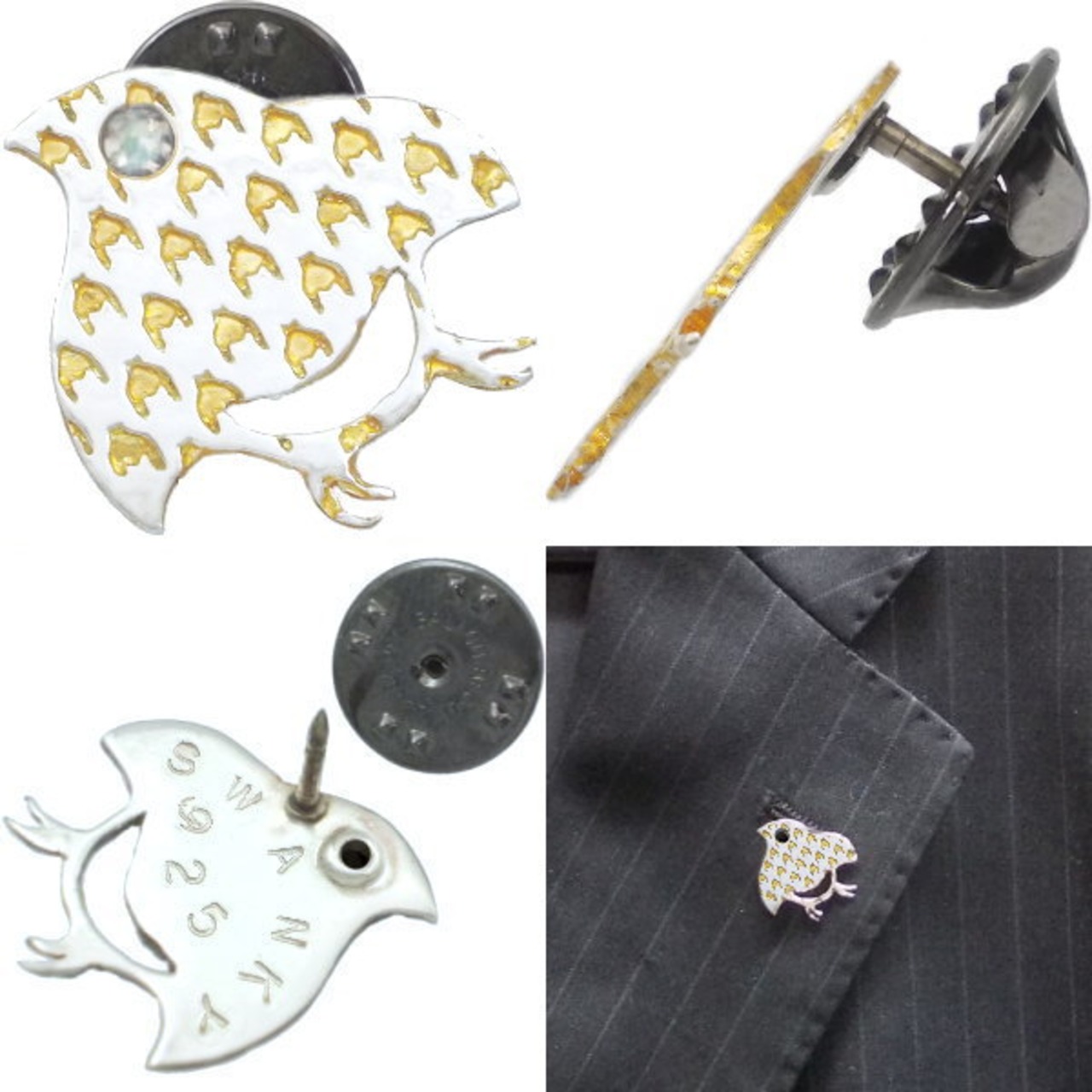 和風の千鳥柄の中にセラミックゴールドの千鳥格子を掛け合わせたピンバッヂ。しかも目の部分には誕生石をセッティング。バースデーストーンの他シックなブラック、気分も運気も上げてくれそうなイエローのジルコニアも用意、誕生月に拘らずマイカラーでも選んでほしい。