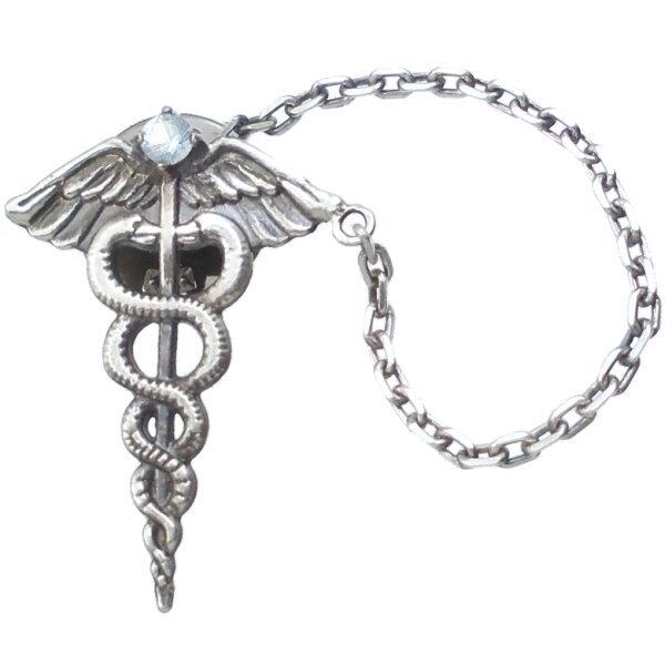 神々の使者として現代においては交通、商業のシンボル、アメリカ軍では医療のシンボル。神話の時をへてなお色褪せいないデザインの杖に誕生石をセッティングした神々しいピンズ。