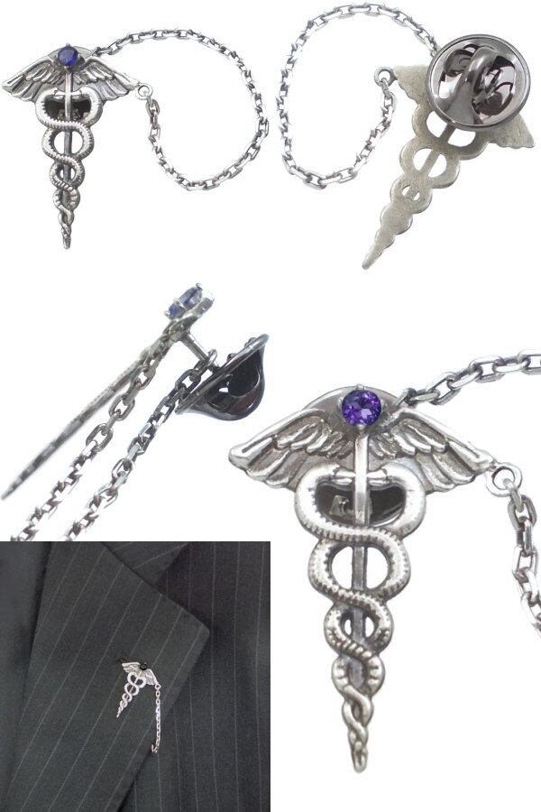 神々の使者として現代においては交通、商業のシンボル、アメリカ軍では医療のシンボル。神話の時をへてなお色褪せいないデザインの杖に誕生石をセッティングした神々しいピンズ。
