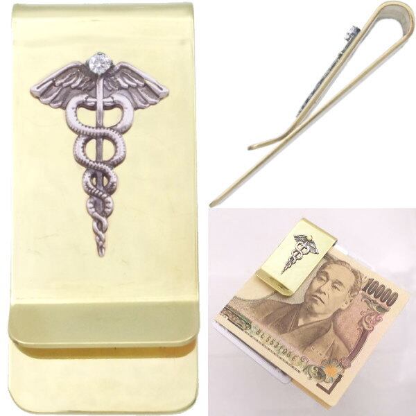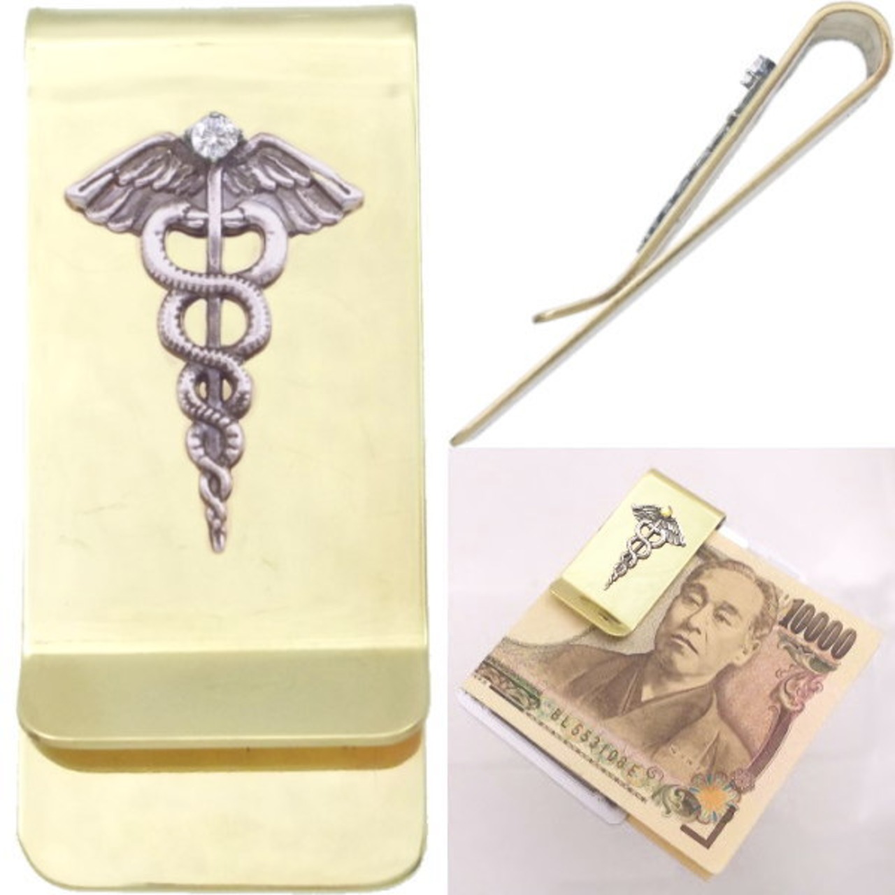 ★ギリシャ神話の使者ヘルメスの杖カドゥケウスとバースデーストーンのブラスボディマネークリップ。