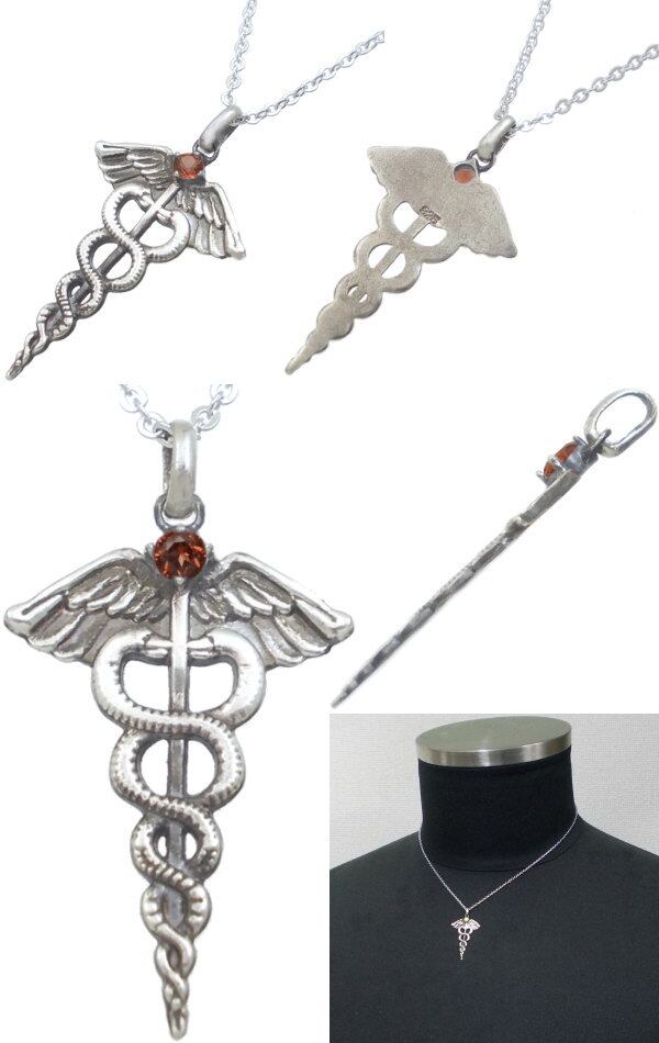 神々の使者として現代においては交通、商業のシンボル、アメリカ軍では医療のシンボル。神話の時をへてなお色褪せいないデザインの杖に誕生石をセッティングした神々しいペンダント。