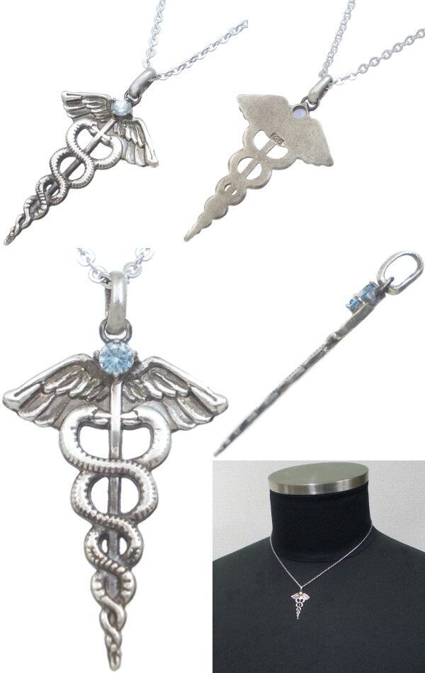 神々の使者として現代においては交通、商業のシンボル、アメリカ軍では医療のシンボル。神話の時をへてなお色褪せいないデザインの杖に誕生石をセッティングした神々しいペンダント。