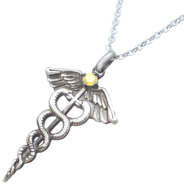 神々の使者として現代においては交通、商業のシンボル、アメリカ軍では医療のシンボル。神話の時をへてなお色褪せいないデザインの杖に誕生石をセッティングした神々しいペンダント。