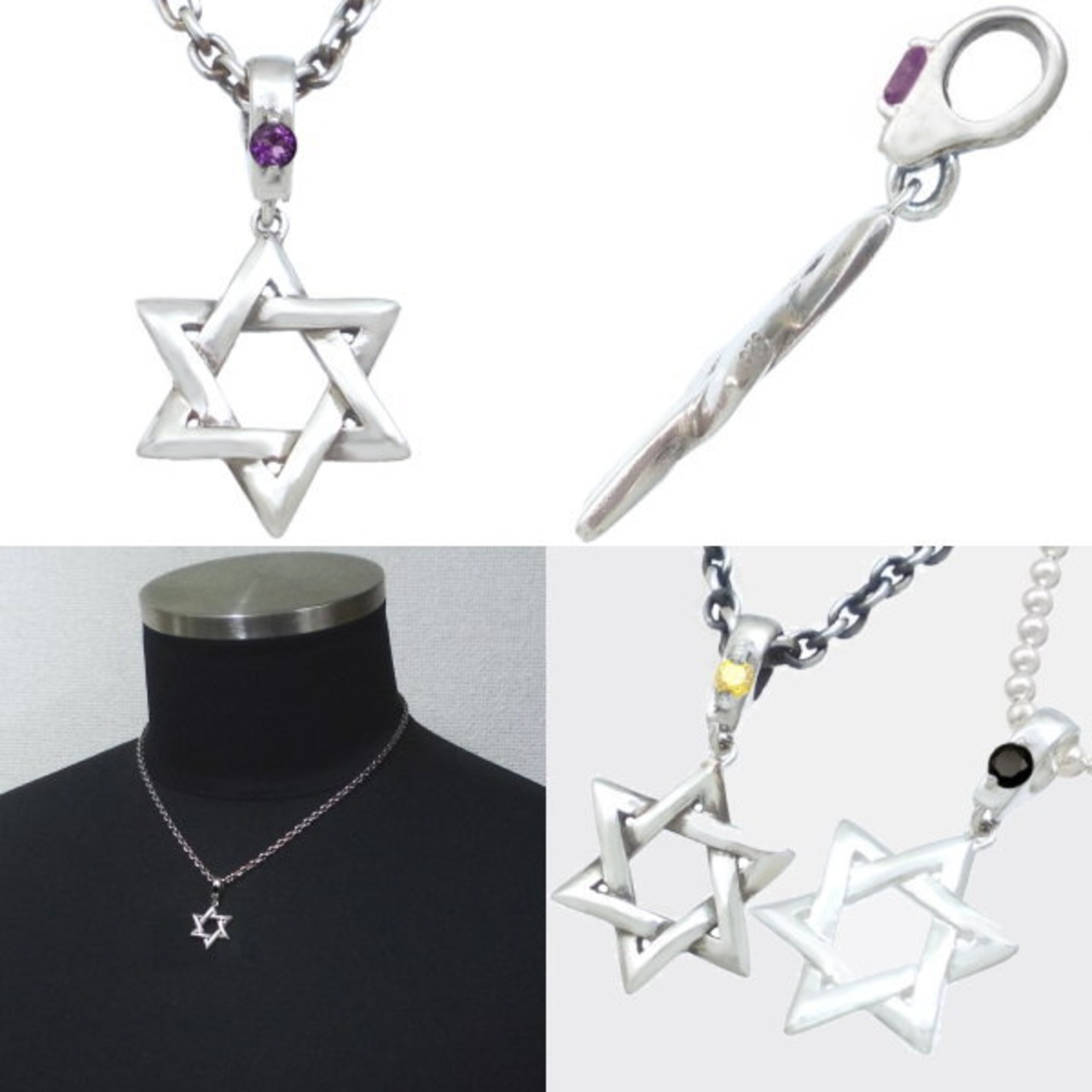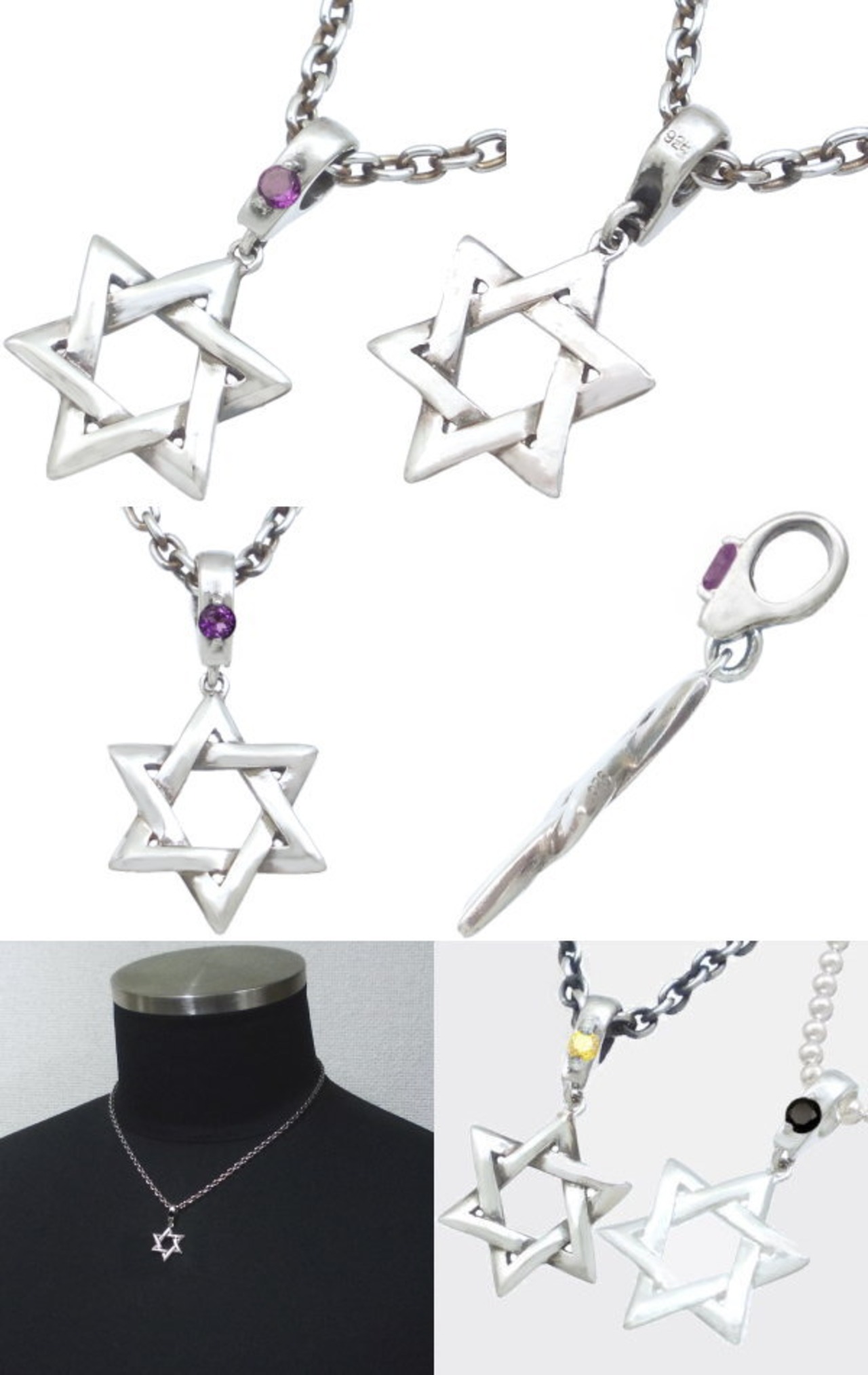 ダビデの星ヘキサグラムをナチュラルな立体感の山型に仕上げたペンダントトップ。シンプルな3種のリバーシブルタイプに続きバースデーストーンとのコンビが登場。