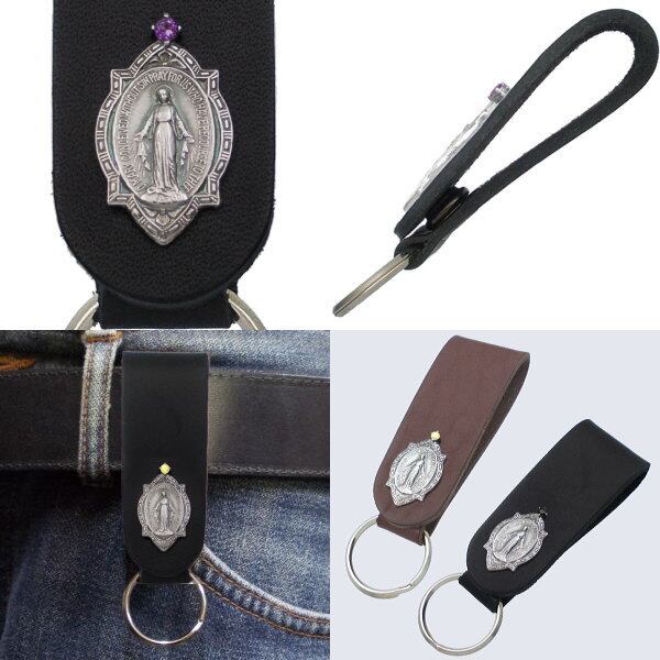 (2月)アメジスト フレーム マリアメダイ ブラックレザー キーホルダー 誕生石*BH-031