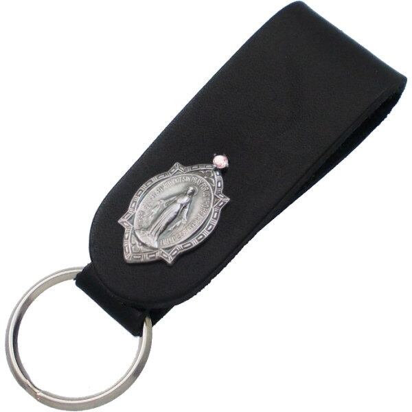 (10月)ピンクトルマリン フレーム マリアメダイ ブラックレザー キーホルダー 誕生石*BH-031