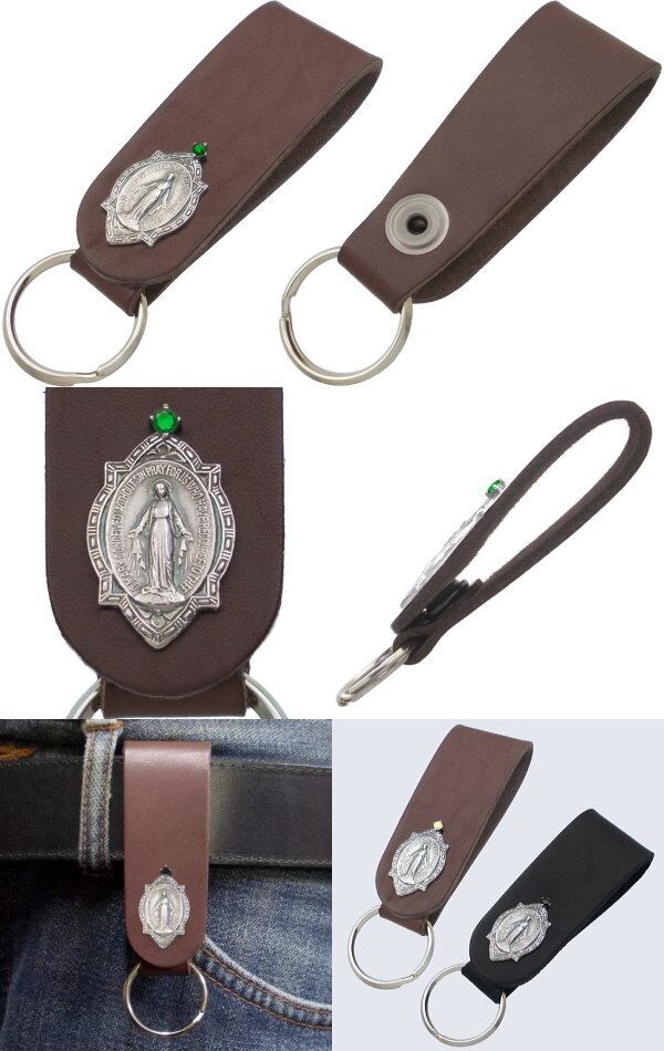 (5月)エメラルドグラス フレーム マリアメダイ ブラウンレザー キーホルダー 誕生石*BH-032
