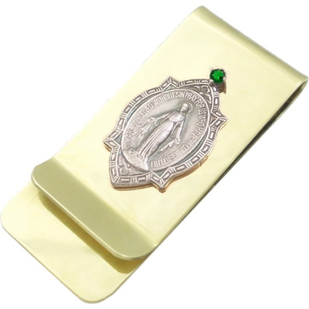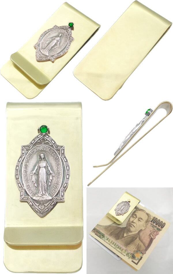 (5月)エメラルドグラス フレーム マリアメダイ ブラスマネークリップ 誕生石*BM-1049