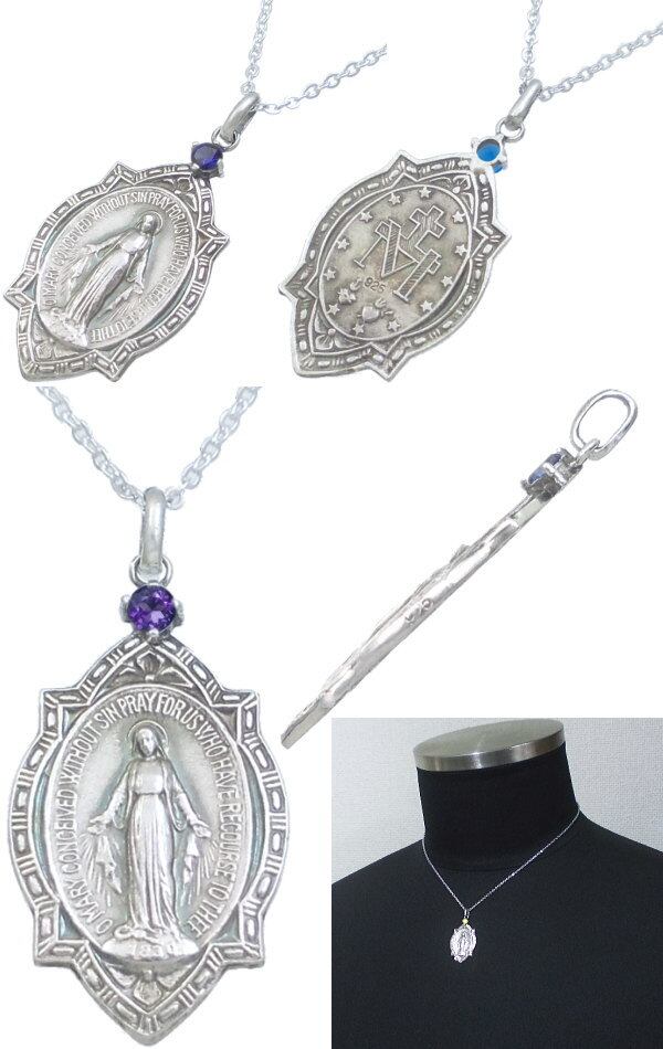 (9月)サファイア フレーム マリアメダイ シルバーペンダントネックレス 誕生石*BP-1080