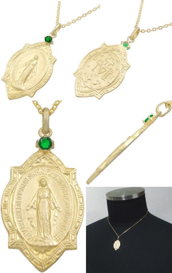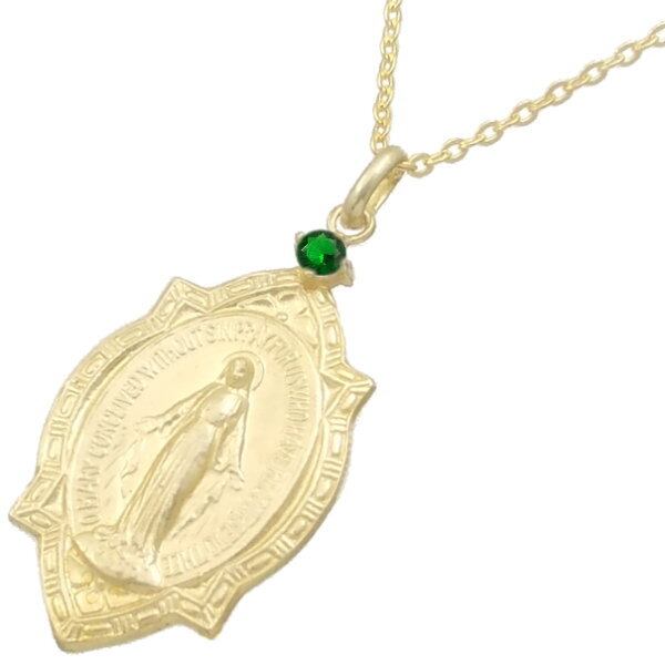 (5月)エメラルドグラス ゴールドコート フレーム マリアメダイ シルバーペンダントネックレス 誕生石*BP-1081