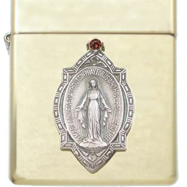 (1月)ガーネット フレーム マリアメダイ ブラスジッポ 誕生石*BZ-1090