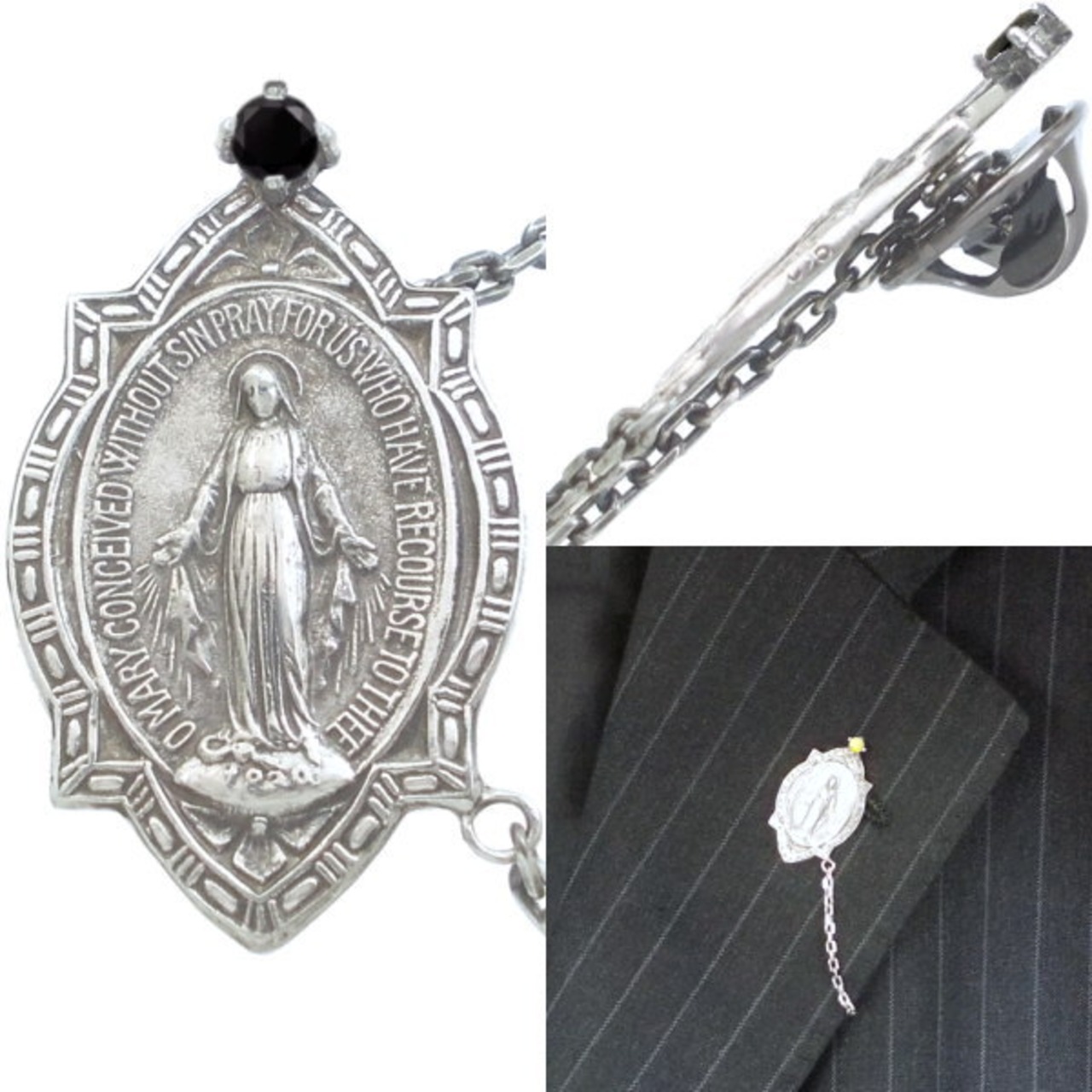 ブラックCZ フレーム マリア チェーン シルバーピンバッジ ピンズ*BK-1137
