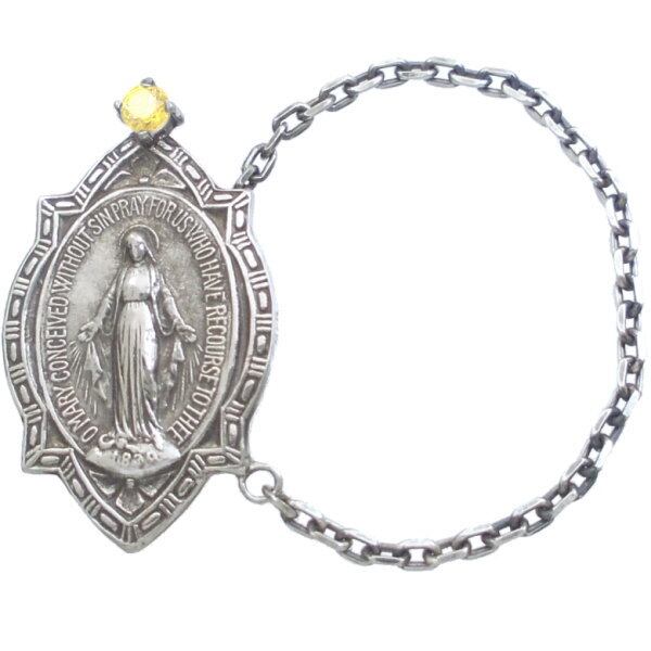 楕円のマリアメダイをゴシックフレームで囲むアンティークな趣きで誕生石を合わせたお守り代わりにもおススメ。