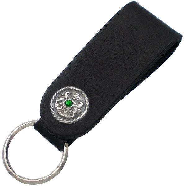 (5月)エメラルドグラス アンティーク エンブレム ブラックレザー キーホルダー 誕生石*BH-033