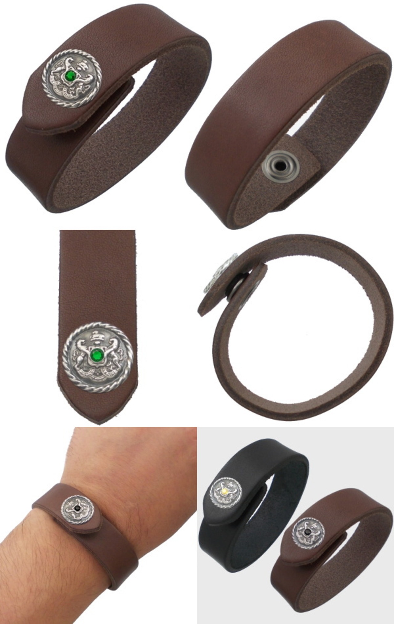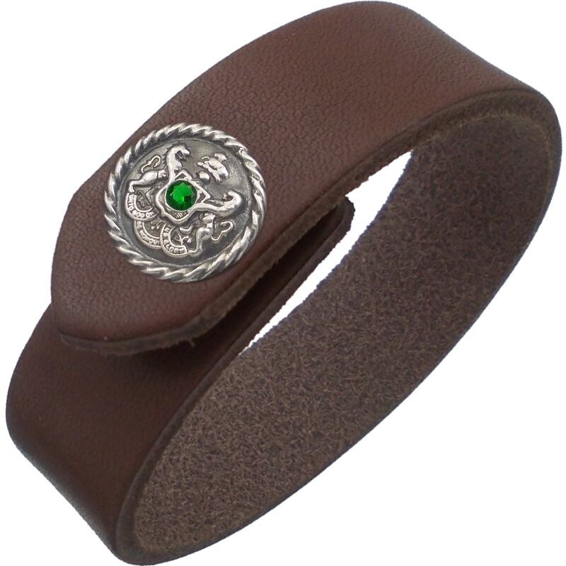 (5月)エメラルドグラス アンティーク エンブレムブラウンレザーブレスレット 誕生石 誕生石*BB-1038