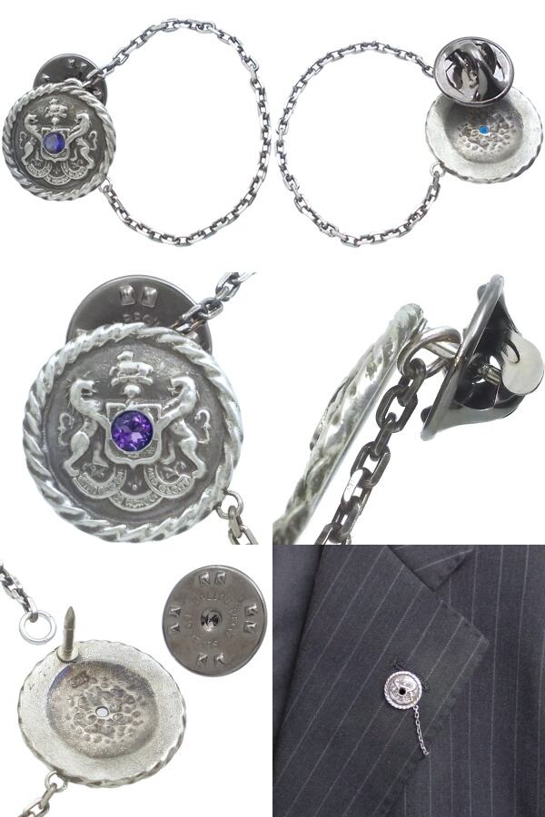 (9月)サファイア アンティーク エンブレム チェーン シルバーピンバッジ ピンズ 誕生石*BK-1140