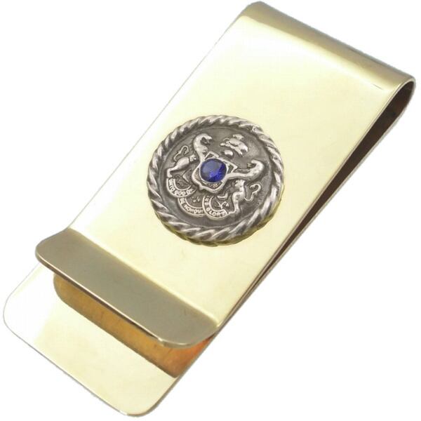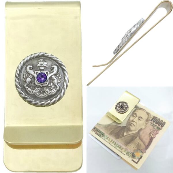 ★クラシックなヨーロッパのエンブレムデザインとバースデーストーンのブラスボディマネークリップ。
