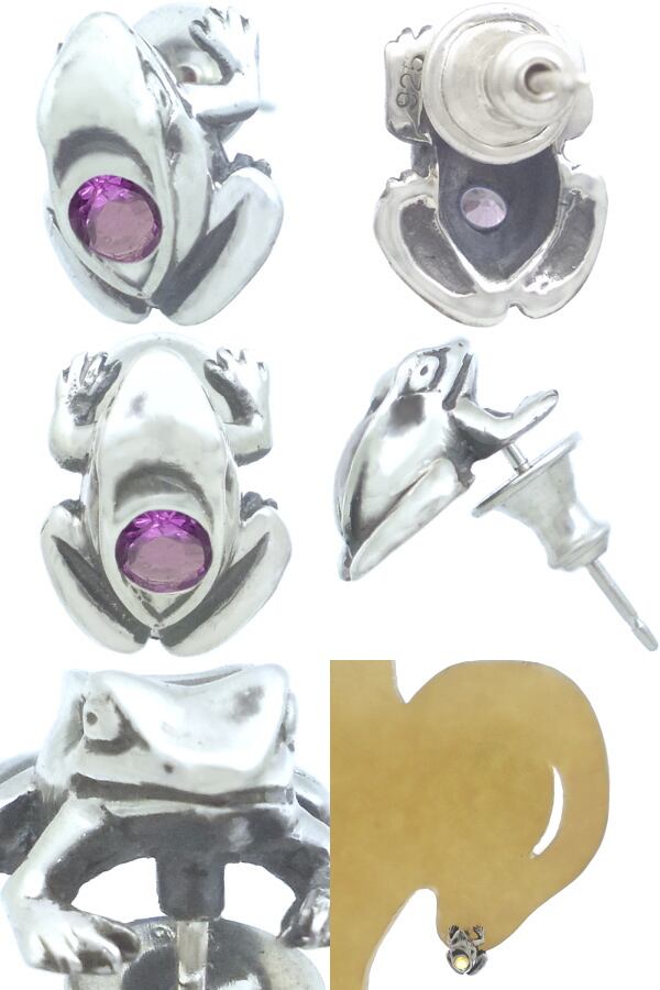 ホワイト仕上げと燻し仕上げのかえるのデザイン。無事帰る、福カエルなどの縁起が良いと言われる蛙モチーフと誕生石を含むストーンとの幸運のコンビネーション。