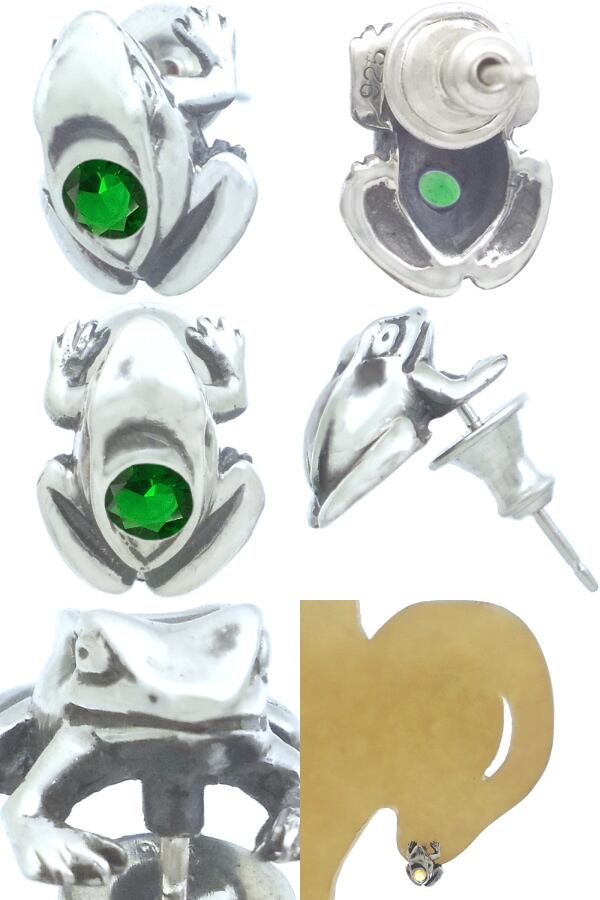 ホワイト仕上げと燻し仕上げのかえるのデザイン。無事帰る、福カエルなどの縁起が良いと言われる蛙モチーフと誕生石を含むストーンとの幸運のコンビネーション。