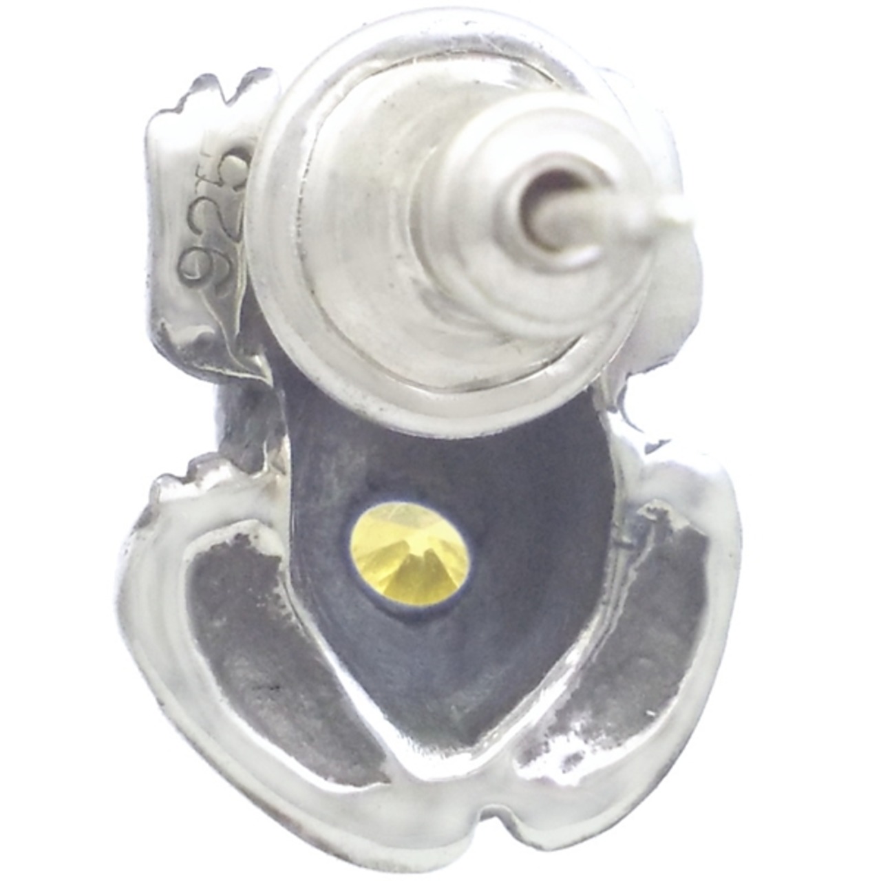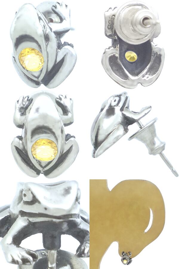 ホワイト仕上げと燻し仕上げのかえるのデザイン。無事帰る、福カエルなどの縁起が良いと言われる蛙モチーフと誕生石を含むストーンとの幸運のコンビネーション。